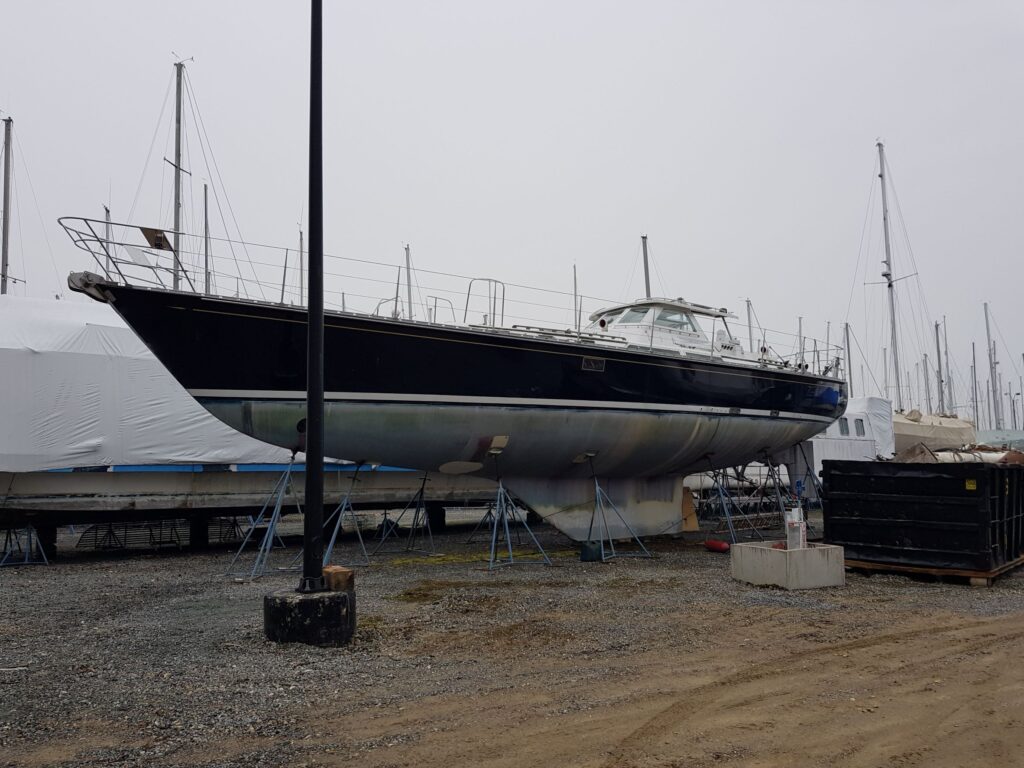 It is a massive project 62’ 1” length (l.o.a), 15’2 ½” beam (that is the widest width of the boat), a draft of 8’ (the depth of water when you hit the bottom), and a displacement of 65,000 lb. The displacement is the weight of the amount of water it displaces when in the water. The ballast (weight under the boat, to keep the boat upright) alone is 28,000 lb, which is roughly 14 tons! All these are original specification data, not counting that both masts, engines, generators, sails, anchors, chains… are missing.
