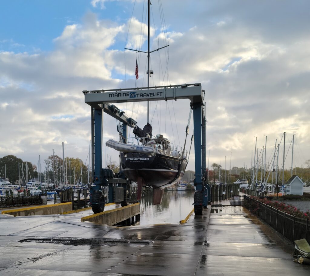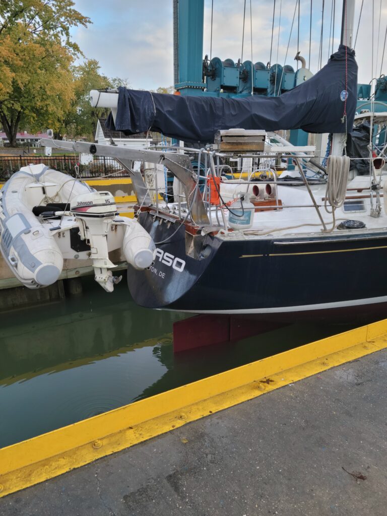 October 23 2022 saw Pegaso in the water, for the first time in now 17 years. After a few days of testing systems that could only be tested in the water (generator, engine, sensors) the evening of October 28 was high tide, full moon, and incoming storm surge to get out of the shallow Herrington Harbour North. Three guys, Fred Probst, Rick Macomber, and I left the slip and ventured out into the pretty choppy darkness of Herrington Bay, on our way of a 3-4 hour ride to the Annapolis anchorage where I would wait for 2 weeks for the appointment of the mast step.